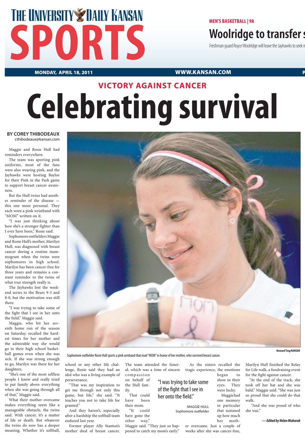 I wanted to fill in for our softball writer when she went out of town because I needed to feel the thrill of doing a game recap again. What I found was much more endearing. KU softball player Rosie Hull tweeted about her mother’s cancer and I asked if it was OK to talk to about the subject. The Hull sisters were very emotional during the interview, but answered everything with class. They even thanked me individually for doing the story, which made it that much more rewarding.